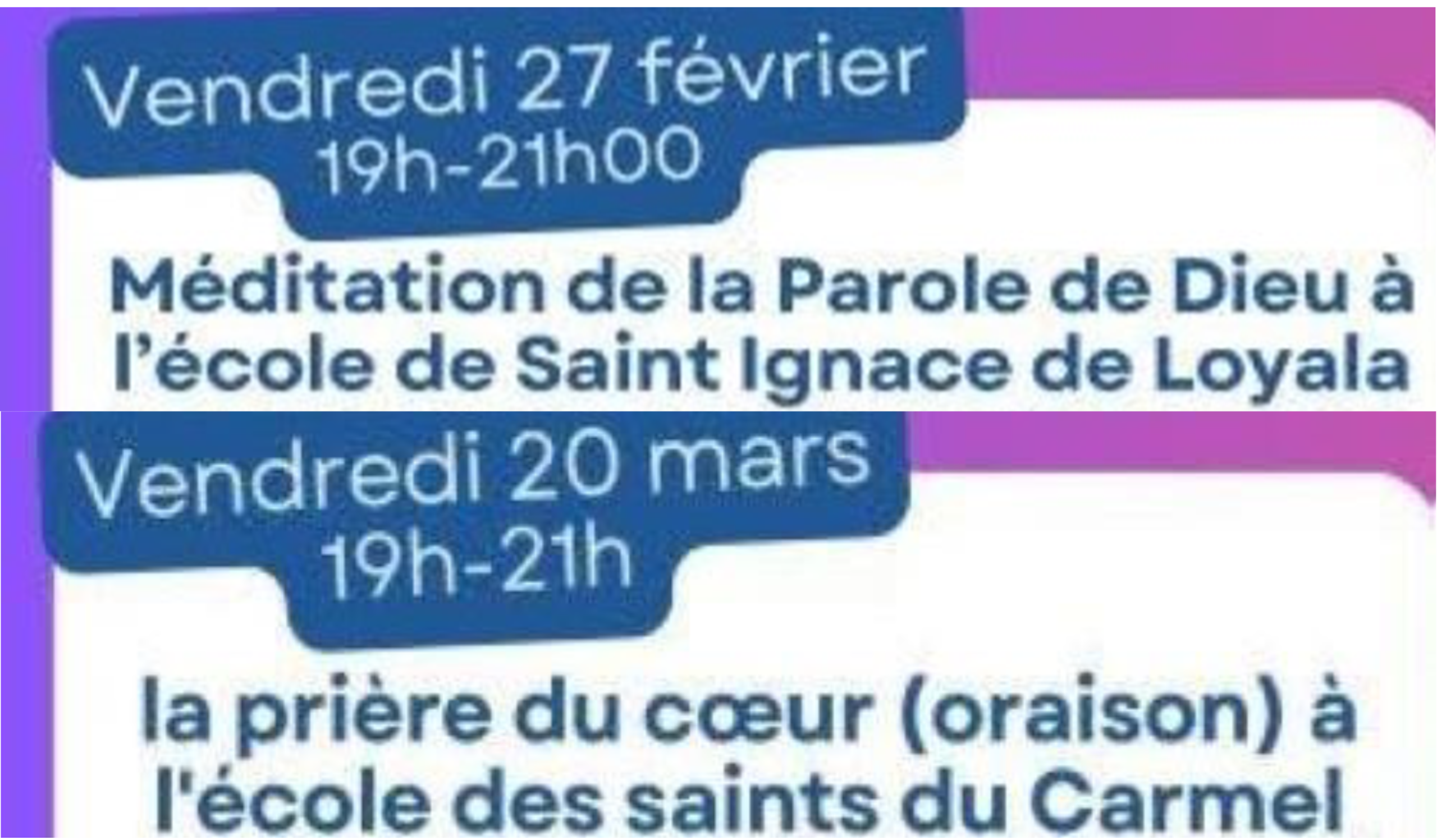 Le 27 février, Laure et Benoît ont proposé de vivre une expérience de méditation de la Parole à la manière de saint Ignace de Loyola. (cf. Prie en chemin - site et appli -) Le texte proposé était celui de la Transfiguration. Après une mise en présence du Seigneur, il s’agit de lire plusieurs fois le texte, de se représenter la scène en utilisant nos sens (voir le lieu, le paysage, les odeurs, les personnages, les paroles, les émotions…). Vient ensuite la demande de grâce selon ce qui nous habite : un besoin de paix, une demande sur un point précis... S'ensuit un temps de colloque : on expose au Seigneur ce qui a été important pour nous pendant ce temps de prière. Enfin, on conclut avec la prière du Notre Père. Nous avons pu partager ensuite sur les fruits de ce temps de prière.